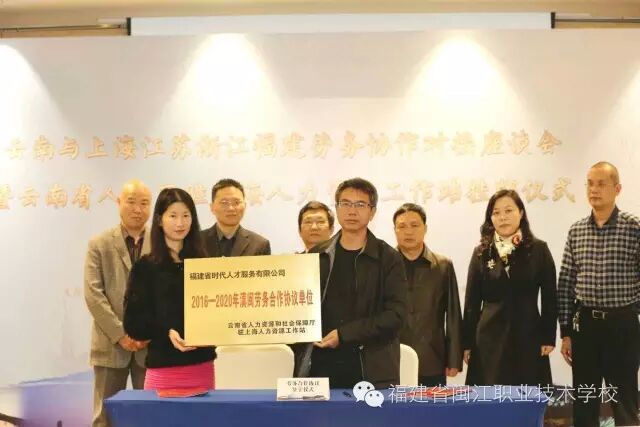 与福建省闽江职业技术学校一母同胞的时代人才公司受邀做为福建省的人力资源公司的代表参加会议。会上签定了《劳务合作协议》,并被授予了“2016-2020年滇闽劳务合作协议单位”。为今后的滇闽工作奠定了更好的基础,提供了更有力的平台。